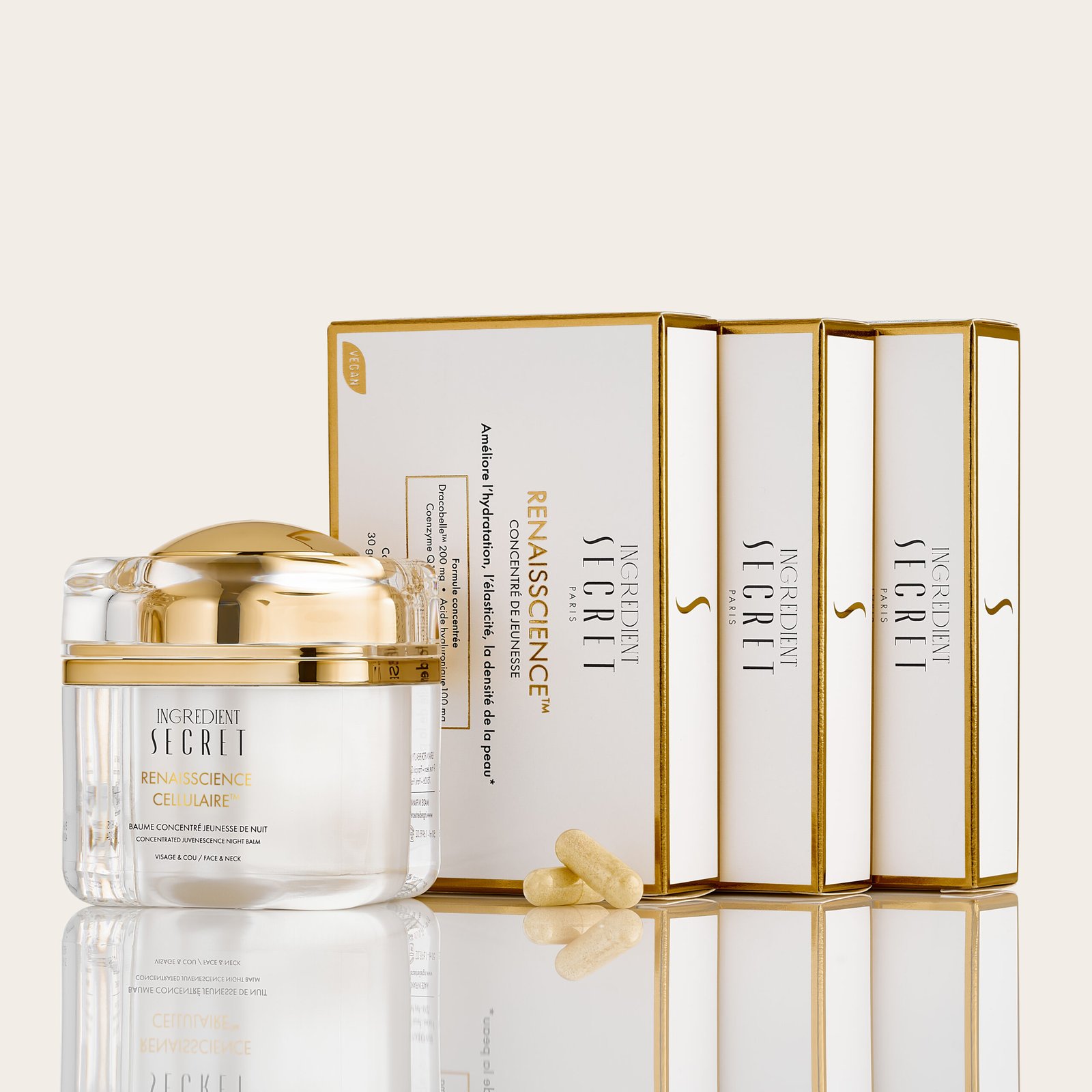 SYNERGIE IN & OUT: Un « twin » set créé en parfaite synergie pour booster la beauté de la peau de l’intérieur! Le nutricosmétique agit dans l’hypoderme pour apporter sa puissance cellulaire régénérante, antioxydante et une hydratation intense de l’intérieur pendant la journée. Le baume de sommeil enveloppe l’épiderme jusqu’à pénétrer le derme en délivrant son pouvoir régénérant, anti-rides, repulpant et raffermissant pendant la nuit.