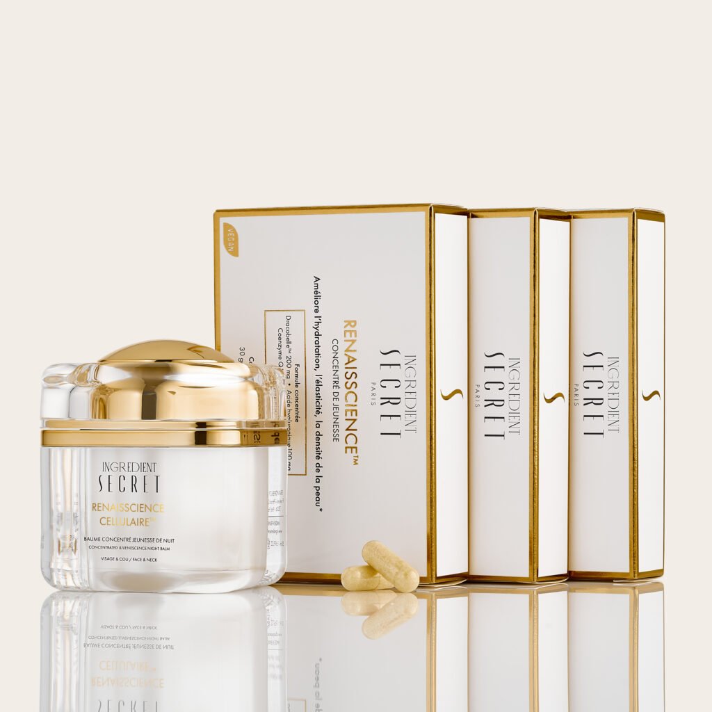 To ensure maximum effectiveness, it is recommended to act on aging not only from the inside but also from the outside with specific treatments, creams, and serums. This is why Ingredient Secret created the IN & OUT Ritual combining the power of skillfully targeted and dosed supplementation with anti-wrinkle creams loaded with active ingredients such as our Youth Concentrate Balm.